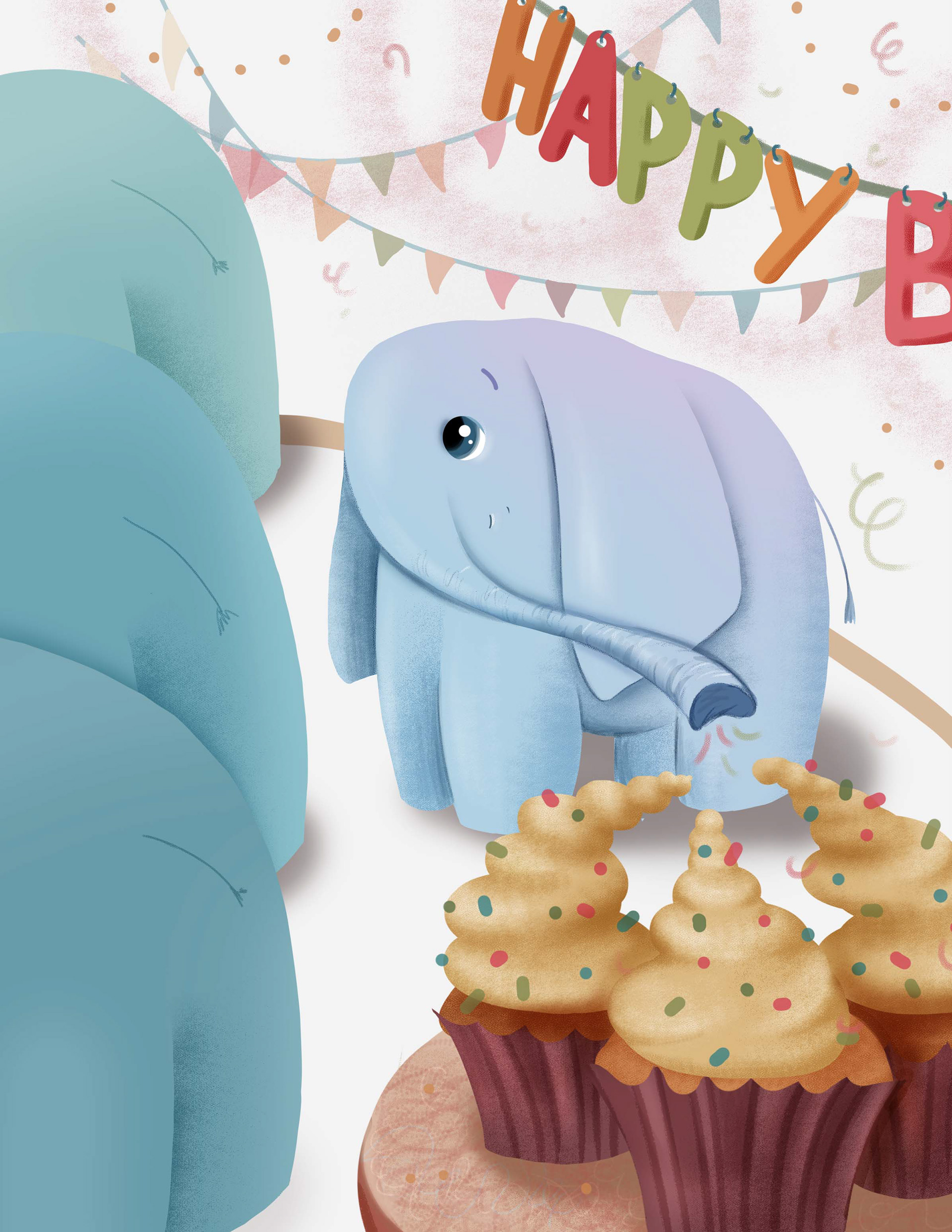 Elephant and cupcakes. birthday card illustration